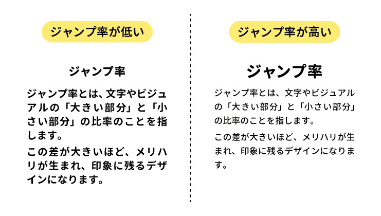 ポスターで情報を配置する際に欠かせない考え方がジャンプ率です。ジャンプ率とは、文字やビジュアルの「大きい部分」と「小さい部分」の比率のことを指します。この差が大きいほど、メリハリが生まれ、印象に残るデザインになります。