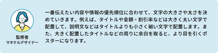 タイトルは大きく、補足情報は小さくすることで、見る人は瞬時に重要な情報を理解できます。