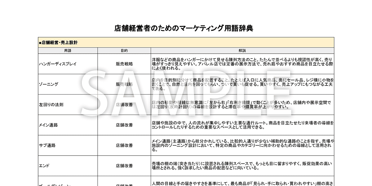 店舗経営に関連したマーケティング用語をまとめたリストです。30個のワードをリスト形式で紹介しています。店舗経営や戦略立案の参考にお使いください。