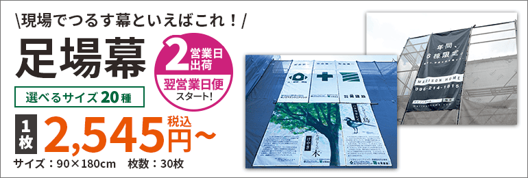お知らせ一覧に戻る 横断幕・懸垂幕キング・現場シートキングにて足場幕・現場シートの2営業日出荷を開始しました! リリース 2025年9月25日 2025年9月25日から株式会社イタミアートの運営するSP商材専門ECサイト「横断幕・懸垂幕キング」「現場シートキング」にて足場幕・現場シートが最短2営業日で出荷可能になりました!急ぎで工事現場や建築現場に幕を設置したい場合のご利用におすすめです!この機会にぜひご利用ください。 お見積・ご注文は24時間HPより可能となっております。 株式会社イタミアートでは、のぼり旗、幕などサイネージ分野で獲得したお客様に対し親和性の高い商品群を取り揃えてまいります。今後も様々な商品で低価格、小ロット販売を実現し更なるお客様の商売繁盛に貢献していきます。 【該当商品ページURL】 横断幕・懸垂幕キング https://www.i-maku.com/page/ashiba_smf 現場シートキング https://www.i-genbasheet.com/page/gst_smf