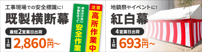 お知らせ一覧に戻る 横断幕・懸垂幕キングで「既製横断幕」「紅白幕」の販売を開始しました! リリース 2025年10月15日 2025年10月15日から株式会社イタミアートの運営するSP商材専門ECサイト横断幕・懸垂幕キングにて「既製横断幕」「紅白幕」の販売を開始しました!用途に合わせて選べる様々なデザインの既製横断幕、式典やイベントで使用できる紅白幕を取り扱っています。既製横断幕はすでにデザインが完成しているため、すぐに購入したい方におすすめです。紅白幕にはロープが付いてくるため、購入後すぐに設置できます。この機会にぜひご確認ください。 お見積・ご注文は24時間HPより可能となっております。 株式会社イタミアートでは、のぼり旗、幕などサイネージ分野で獲得したお客様に対し親和性の高い商品群を取り揃えてまいります。今後も様々な商品で低価格、小ロット販売を実現し更なるお客様の商売繁盛に貢献していきます。 【既製横断幕】 https://www.i-maku.com/categ/11145 【紅白幕】 https://www.i-maku.com/categ/11144