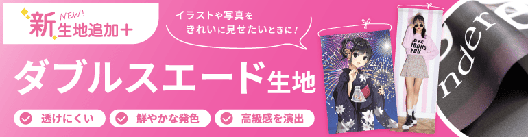 2026年4月27日から株式会社イタミアートの運営するSP商材専門ECサイト「のぼりキング」「横断幕・懸垂幕キング」「展示会キング」「タペストリーキング」にてタペストリーのダブルスエード生地の取り扱いを開始しました!ダブルスエード生地は通常のスエードの約2倍の厚みがあり、しっかりとした質感が特徴です。また、透けにくいため発色が良く、イラストや写真を美しく表現できます。高級感を重視したい方にもおすすめです。